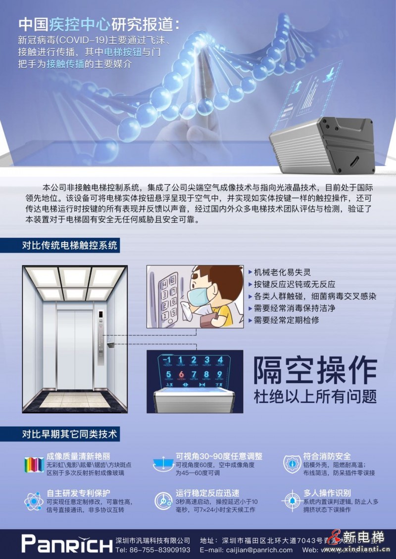 非接觸電梯控制系統(tǒng),集成了汎瑞公司尖端空氣成像技術(shù)(逆向反射技術(shù))與指向光液晶技術(shù),目前處于國際領(lǐng)先地位,具有成像質(zhì)量優(yōu)越,觀看視角廣,無眼暈重影等優(yōu)勢。該設(shè)備可將電梯實(shí)體按鈕懸浮呈現(xiàn)于空氣中,,并實(shí)現(xiàn)觸控操作,所述觸控反應(yīng)并不限于圖像變換與電梯動作,可傳達(dá)電梯運(yùn)行時(shí)按鍵的所有表現(xiàn)并以聲音做出回應(yīng),真正實(shí)現(xiàn)實(shí)體按鍵替代。2020年6月起,該產(chǎn)品已經(jīng)實(shí)際后裝于醫(yī)院,學(xué)校、政務(wù)辦事大廳處的OTIS、MITSUBISHI、HITACHI、ESTEM等各品牌電梯,并穩(wěn)定運(yùn)行中。充分驗(yàn)證了本裝置對于電梯固有安全無任何威脅,且安全可靠運(yùn)行的性能。