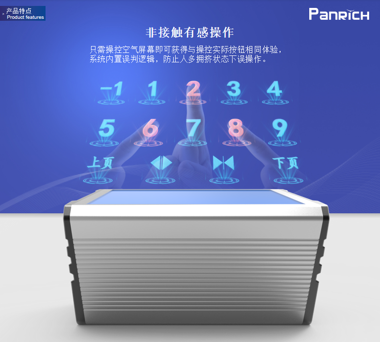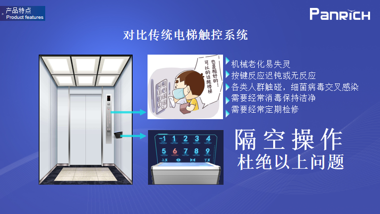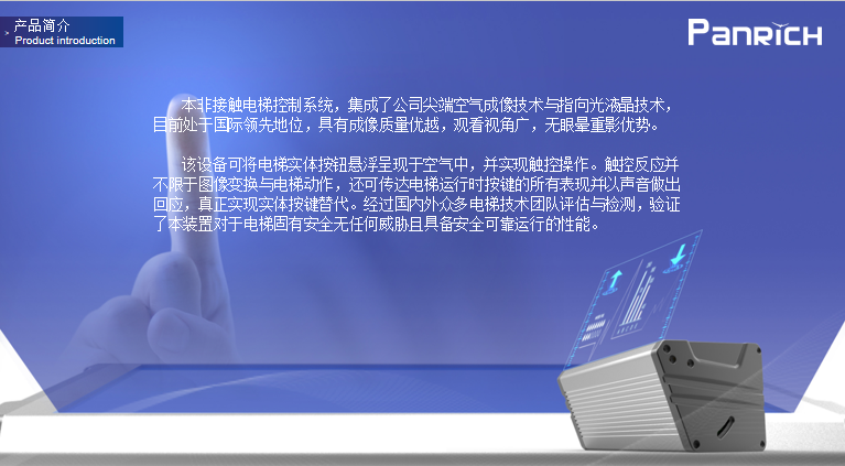 非接觸電梯控制系統,集成了公司尖端空氣成像技術與指向光液晶技術,目前處于國際領先地位,具有成像質量優越,觀看視角廣,無眼暈重影優勢。該設備可將電梯實體按鈕懸浮呈現于空氣中,并實現觸控操作,所述觸控反應并不限于圖像變換與電梯動作,可傳達電梯運行時按鍵的所有表現并以聲音做出回應,真正實現實體按鍵替代。